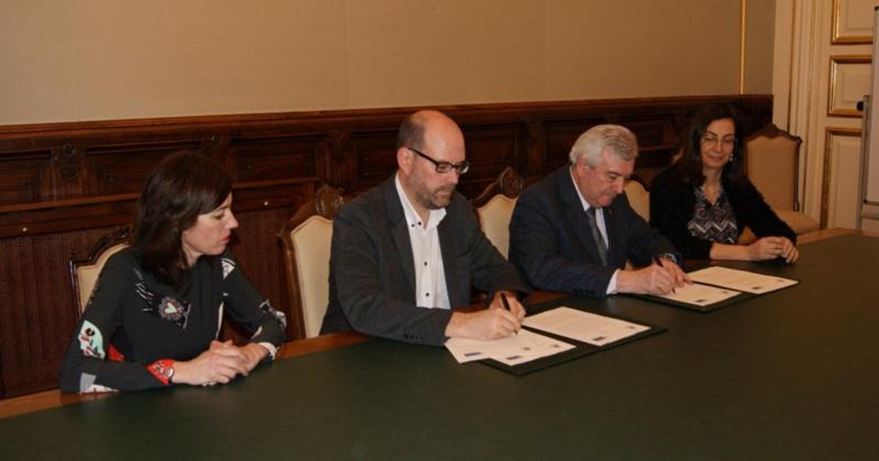 O reitor da Universidade de Santiago, Juan Viaño, e o alcalde de Compostela, Martiño Noriega, asinaron este venres o convenio que recupera a convocatoria do Premio Xohana Torres, instituído polo Concello de Santiago en 1993 e interrompido no 2010.