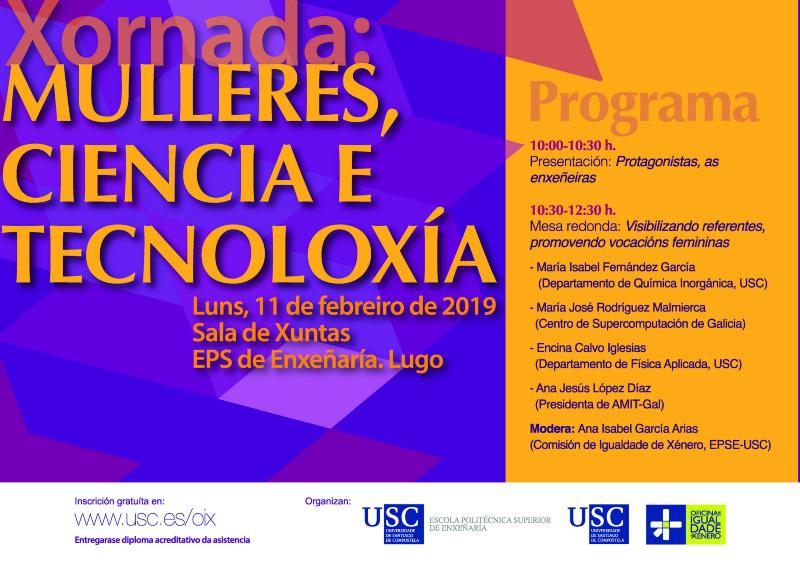 A sesión, de inscrición gratuíta, estará moderada pola profesora e coordinadora da Comisión de Igualdade de Xénero da EPSE, Ana Isabel García Arias, e nela intervirán a profesora do Departamento de Química Inorgánica da USC Isabel Fernández García; María José Rodríguez Malmierca, do Centro de Supercomputación de Galicia; Encina Calvo Iglesias, do Departamento de Física Aplicada da USC, e a presidenta da Asociación de Mulleres Investigadores e Tecnólogas de Galicia (Amit Gal), Ana Jesús López Díaz.