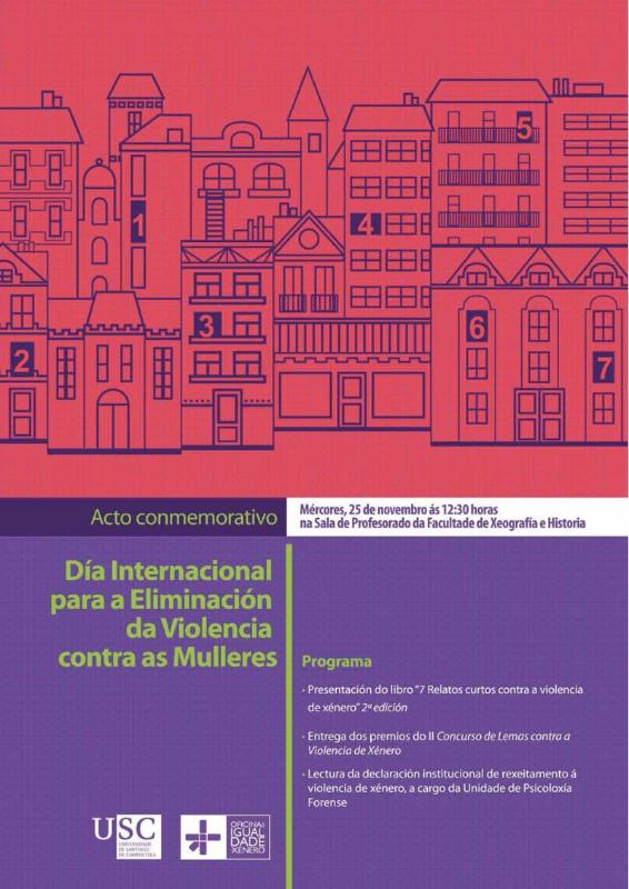 Nesta sesión, na que tamén participan o decano de Xeografía e Historia, Juan Monterroso, e o director do Servizo de Publicacións, Juan l. Blanco Valdés, presentarase a segunda edición do libro 7 relatos curtos contra a violencia de xénero e entregaranse os premios correspondentes ao II Concurso de Lemas contra a violencia de xénero. Ademais, o director da Unidade de Psicoloxía Forense da USC, Ramón Arce Fernández, dará lectura á declaración institucional de rexeitamento á violencia de xénero.