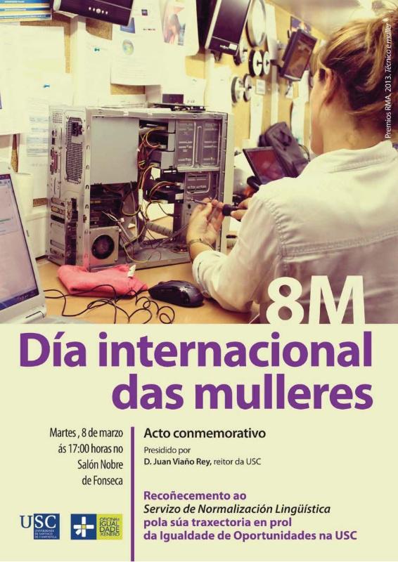 A Universidade de Santiago conmemorará o Día Internacional das Mulleres con varios actos que se estenden máis aló da propia data, o 8 de marzo, cando terá lugar o acto central no que se recoñecerá o labor do Servizo de Normalización Lingüística da USC en prol da igualdade. Este acto central será o martes ás 17.00 horas no Salón Nobre de Fonseca.