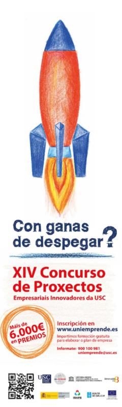 A Universidade de Santiago de Compostela, a través do seu programa de creación de empresas Uniemprende, vén de convocar o XIV Concurso de Proxectos Empresariais Innovadores co obxectivo de impulsar a creación de empresas innovadoras promovidas por estudantes, titulados/as e/ou investigadores/as de calquera das tres universidades galegas, así como dos centros asociados da Uned emprazados en Galicia, ademais de fomentar a innovación empresarial e a xeración de emprego.