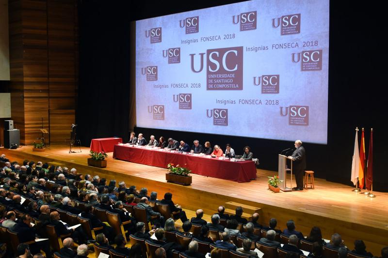 Máis de cincocentas persoas estaban chamadas este venres 21 ao acto anual de entrega das Insignias Fonseca, distinción coa que a USC honra ás traballadoras e traballadores que levan prestando servizos á institución durante máis de 30 anos. Do total das 532 persoas ás que se lle impón esta Insignia, 290 son homes e 240, mulleres, e destes 343 pertencen ao colectivo do persoal docente e investigador e 189 ao de administración e servizos.
