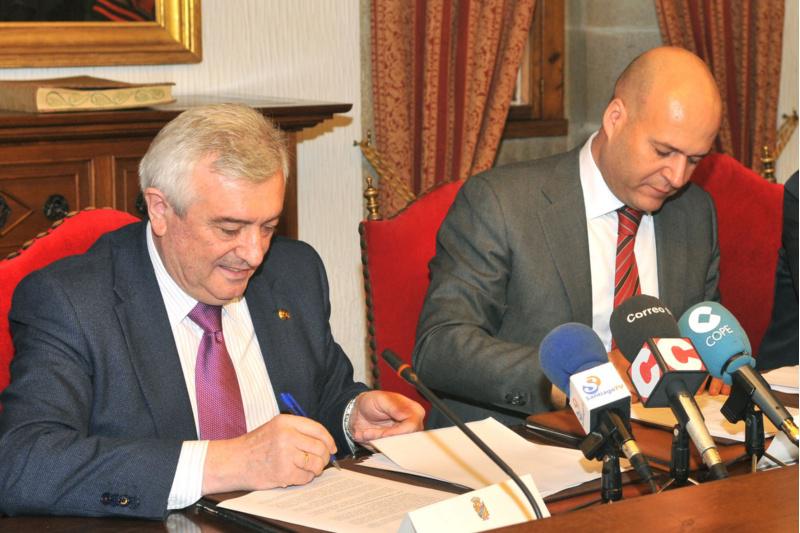 Asinaron o contrato Juan Viaño (esquerda), pola USC, e Ignacio Gastón Najarro, por parte de Ferrovial Servicios. Foto: Santi Alvite