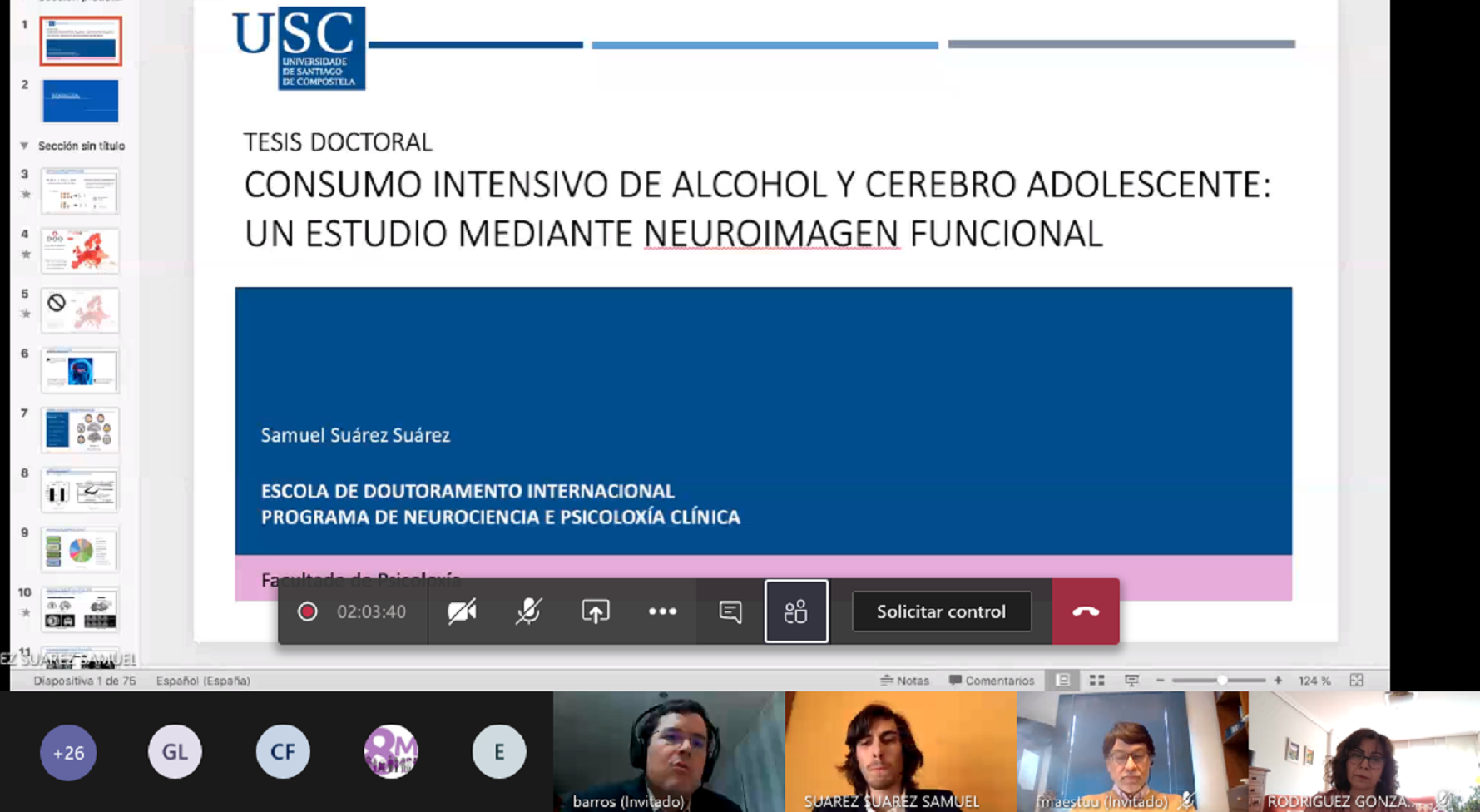 As primeiras experiencias de defensa de teses doutorais en liña na USC resultou todo un éxito, segundo salientou a vicerreitora de Titulacións, María José López Couso. A tese ‘Consumo Intensivo de Alcohol e Cerebro Adolescente: Un estudo mediante neuroimaxen funcional’, realizada por Samuel Suárez e co dirixida por Fernando Cadaveira Mahía e Sonia Doallo Pesado; e a investigación ‘DNA recognition with self-assembled peptide helicates’, presentada  por Jacobo Gómez e dirixida polos profesores Miguel Vázquez López e Marco Eugenio Vázquez Sentis, acadaron a máxima cualificación de sobresaínte cum laude.