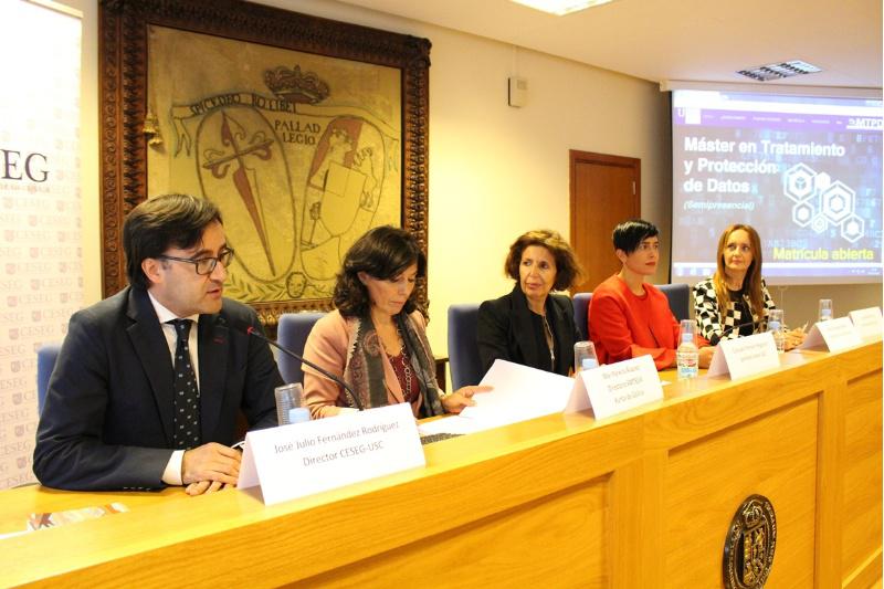 Os detalles do novo posgrao, a impartir entre xaneiro e setembro do vindeiro ano, ofrecéronos este martes na Facultade de Dereito a secretaria xeral da USC, Consuelo Ferreiro; o director do Centro de Estudos de Seguridade de la USC (CESEG), José Julio Fernández; a directora da Axencia de Modernización Tecnolóxica de Galicia (Amtega), Mar Pereira Álvarez; e a directora do mestrado, Luz Mª Ruibal Pereira.
