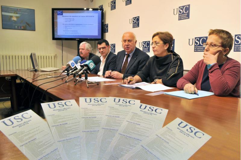 A Universidade de Santiago ofertará o vindeiro curso un total de 59 másteres, entre os que se inclúen cinco novos títulos. O reitor Juan Casares presentou publicamente a oferta de posgrao da USC para 2014-2015 este luns 17 nun encontro cos medios de comunicación. A oferta académica de posgrao, que no presente curso captou o interese de máis de 2.000 estudantes, contempla 48 másteres en Santiago e outros 11 en Lugo. Nas dúas vindeiras semanas, a USC desenvolverá unha serie de xornadas informativas nos dous Campus orientadas a difusión pública desta oferta. Na presentación estiveron presentes ademais o vicerreitor de Titulacións e Persoal Docente e Investigador, Jesús López Romalde; a xefa de servizo de Xestión da Oferta e Programación Académica, Josefa Recalde; o xefe do servizo de Xestión Académica, Ramón García; e a directora da Oficina de Información Universitaria da USC, Maribel Braña. Entre as novas titulacións para o próximo curso inclúense Arqueoloxía e Ciencias da Antigüidade (nova edición), Biotecnoloxía (nova edición), Física, Psicoxerontoloxía e Química. Ademais, están pendentes de estudo para a súa implantación Español como lingua estranxeira e Monarquía de España: século XVI-XVII. Do total, a maior oferta concéntrase na área de Ciencias Sociais e Xurídicas onde o próximo curso se impartirán 18 másteres, seguida dos doce títulos de Ciencias da Saúde, once de Ciencias, nove en Artes e Humanidades e outros tantos en Enxeñaria e Arquitectura. Un tercio dos posgraos que se poderán cursar na USC teñen carácter interuniversitario, nove coas universidades do Sistema Universitario Galego, un coa da Coruña e outros once con diversas universidades do estado, entre elas, as Autónoma de Madrid e de Barcelona, a de Salamanca, País Vasco, Rovira i Virgili, Granada, Zaragoza, Cantabria ou coa Universidade Internacional Menéndez Pelayo, entre outras. Perfís O conxunto de másteres entre os que poderán optar os futuros estudantes contemplan todas as orientacións ous perfís (académico, profesional e investigador), ademais de que tamén se poderán cursar algúns dos títulos que habilitan para o exercicio de profesións reguladas ou cuxa superación é condición requirida para o exercicio profesional. Entre os habilitantes, a USC inclúe na súa oferta académica os másteres de Enxeñaría Agronómica, de Montes e Industrial, os de Profesorado de Educación Secundaria Obrigatoria e Bacharelato, Formación Profesional e Ensino de Idiomas (tanto en Santiago como en Lugo) e o de Psicoloxía Xeral Sanitaria. No apartado de títulos profesionalizantes ou requiridos para o exercicio profesional, inclúense os de Avogacía, que se impartirá en Lugo e en Santiago, e o de Enxeñaría Química e de Bioprocesos. Humanidades O alumnado da área de Humanidades poderán elixir entre un total de nove títulos, oito deles en centros de Compostela: Arqueoloxía e ciencias da antigüidade (25 prazas), Estudos da literatura e da cultura (24), Estudos ingleses avanzados e as súas aplicacións (24), Estudos medievais europeos: imaxes, textos e contextos (25), Historia Contemporánea (21), Lingüística aplicada (10), Lóxica e filosofía da ciencia (15) e Xestión do patrimonio artístico e arquitectónico, museos e mercado da arte (30). No Campus de Lugo, a oferta de másteres universitarios concéntrase no título de Servizos culturais (25 prazas). Ciencias O total dos once másteres da área de Ciencias impartiranse en Compostela. Os posgraos ofertados son Acuicultura (10 prazas), Bioloxía mariña (10), Biotecnoloxía (38), Enerxías renovables e sustentabilidade enerxética (25), Física (33), Fotónica e tecnoloxías do láser (35), Innovación en seguridade e tecnoloxía alimentaria (28), Matemáticas (25), Química (80), Química teórica e modelización computacional (8) e Técnicas estatísticas (25). Ciencias da Saúde Na área de Ciencias da Saúde, a oferta ascende a 12 másteres, dos que dous cursaranse en Lugo: Investigación en medicina e sanidade veterinaria (25 prazas) e Prevención de riscos laborais e saúde medioambiental (22). Os que se poderán cursar en Compostela son Atención sanitaria, xestión e coidados, coa posibilidade de realizar a especialidade de xestión ou clínica (30 prazas), Ciencias odontolóxicas (24), Condicionantes xenéticos, nutricionais e ambientais do crecemento e do desenvolvemento (25), Investigación biomédica (25), Investigación e desenvolvemento de medicamentos (28), Investigación en ciencias da visión (10), Neurociencia (30), Psicoxerontoloxía (25), Xerontoloxía (50) e Psicoloxía xeral sanitaria (33), esta última de carácter habilitante. Ciencias Sociais e Xurídicas Os quince títulos de Santiago e outros tres do Campus de Lugo constitúen a oferta maior, no relativo ás areas de coñecemento. En Lugo, o estudantado poderá optar por Avogacía (35 prazas), Dirección de Empresas (23) ou por Profesorado de Educación Secundaria Obrigatoria e Bacharelato, Formación Profesional e Ensino de Idiomas que neste Campus ofertará 60 prazas repartidas entre as especialidades de Ciencias experimentais, matemáticas, e tecnoloxía e informática; de Formación Profesional: sector primario e secundario; e de Linguas e literatura. En Santiago, poderase cursar Avogacía (35 prazas), Comunicación e industrias creativas (35), Desenvolvemento económico e innovación (25), Dereito das administracións e institucións públicas (30), Dirección de Empresas (23), Estudos avanzados sobre a linguaxe, a comunicación e as súas patoloxías (25), Estudos internacionais (40), Investigación en educación, diversidade cultura e desenvolvemento comunitario (29), Marketing, consultoría e comunicación política (40), Planificación e xestión do desenvolvemento territorial (30), Procesos de formación (25), Psicoloxía do traballo e as organizacións, psicoloxía xurídica-forense e intervención social (25), T