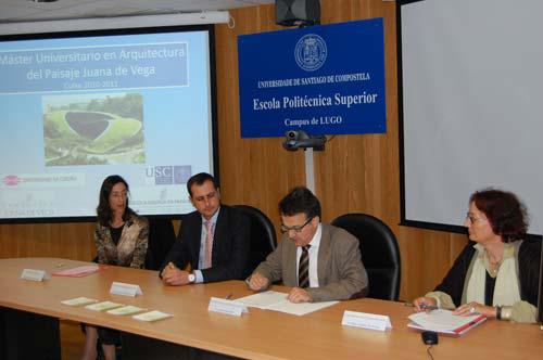 Este renovado curso de posgrao presentárono este martes na Escola Politécnica Superior de Lugo a súa coordinadora na USC, María Isabel Iglesias; o director da Escola Politécnica Superior de Lugo, Javier Bueno; o director da Fundación Juana de Vega, José Manuel Andrade; e a directora da Escola Galega da Paisaxe, Isabel Aguirre.