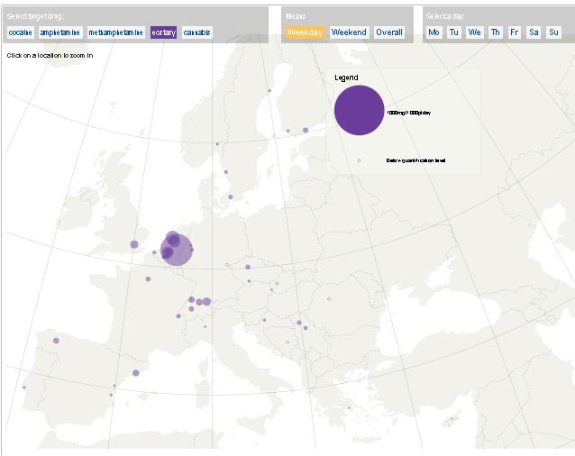 O uso de anfetaminas, aínda que bastante uniforme, mostrou niveles de consumo máis elevados no norte e noroeste de Europa. Pola súa banda, o consumo de metanfetamina en xeral é baixo e concentrado na República Checa e Eslovaquia, con presenza no este de Alemaña e norte de Europa. En canto aos patróns semanais de consumo, os niveis de cocaína e éxtase aumentaron considerablemente as fins de semana na maioría das cidades mentres que o consumo de metanfetamina e cannabis se distribúe dunha forma máis uniforme ao longo da semana.