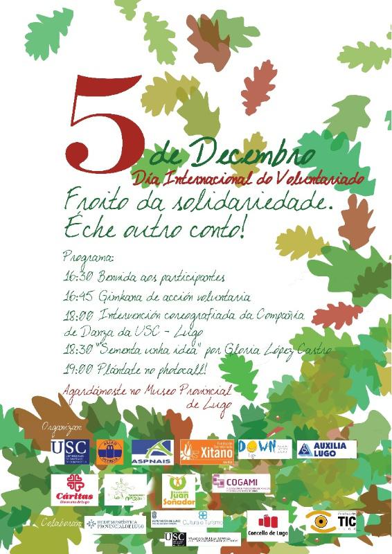 O programa de actos ábrese ás 16.30 horas cun acto de benvida ás persoas que se acheguen ao Museo Provincial de Lugo, onde de seguido se desenvolverá unha xincana sobre o valor da acción voluntaria en Lugo e que vén ser o “froito da solidariedade” co que se lle da título a esta xornada, segundo indicou a responsable da Oficina de Voluntariado da USC no campus de Lugo, Fátima Teixeiro. Xa dentro dos actos centrais, esta xornada conta tamén cunha intervención da Compañía de Danza da USC e cuxos actores/actrices realizarán unha performance sobre o valor simbólico do voluntariado a partir das 18.00 horas. Ao remate desta actuación, darase lectura ao manifesto do día do voluntariado. Todos os actos organizados ao abeiro desta xornada co gallo do Día Internacional do Voluntariado teñen de fío condutor a historia dun carballo centenario. A voz protagonista do relato ‘Sementa unha idea’, escrito por Gloria López Castro e que pon o seu acento no valor da cooperación e o voluntariado. A celebración do Día Internacional do Voluntariado en Lugo ten a súa orixe no ano 2007 nunha iniciativa levada a cabo por dez entidades sociais, entre as que se atopa a Universidade de Santiago de Compostela e conta coa colaboración do Concello de Lugo, a Deputación Provincial, a Dirección Xeral de Xuventude e Voluntariado da Xunta de Galicia, así como coa Fundación TIC.