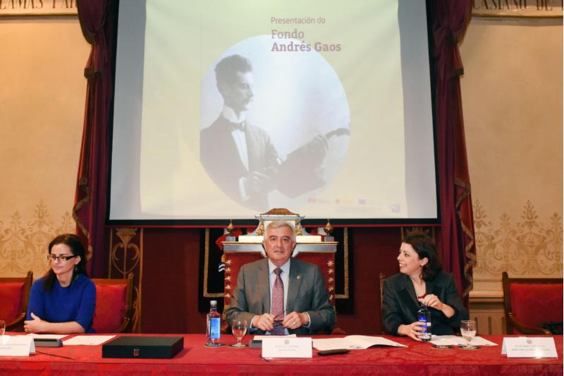 O reitor Juan Viaño presidiu este martes no Paraninfo o acto académico de presentación do Fondo Andrés Gaos, doado recentemente á USC polo seu fillo, Andrés Gaos Guillochón. O fondo do recoñecido compositor e violinista quedará depositado na Biblioteca América para o seu estudo e divulgación.