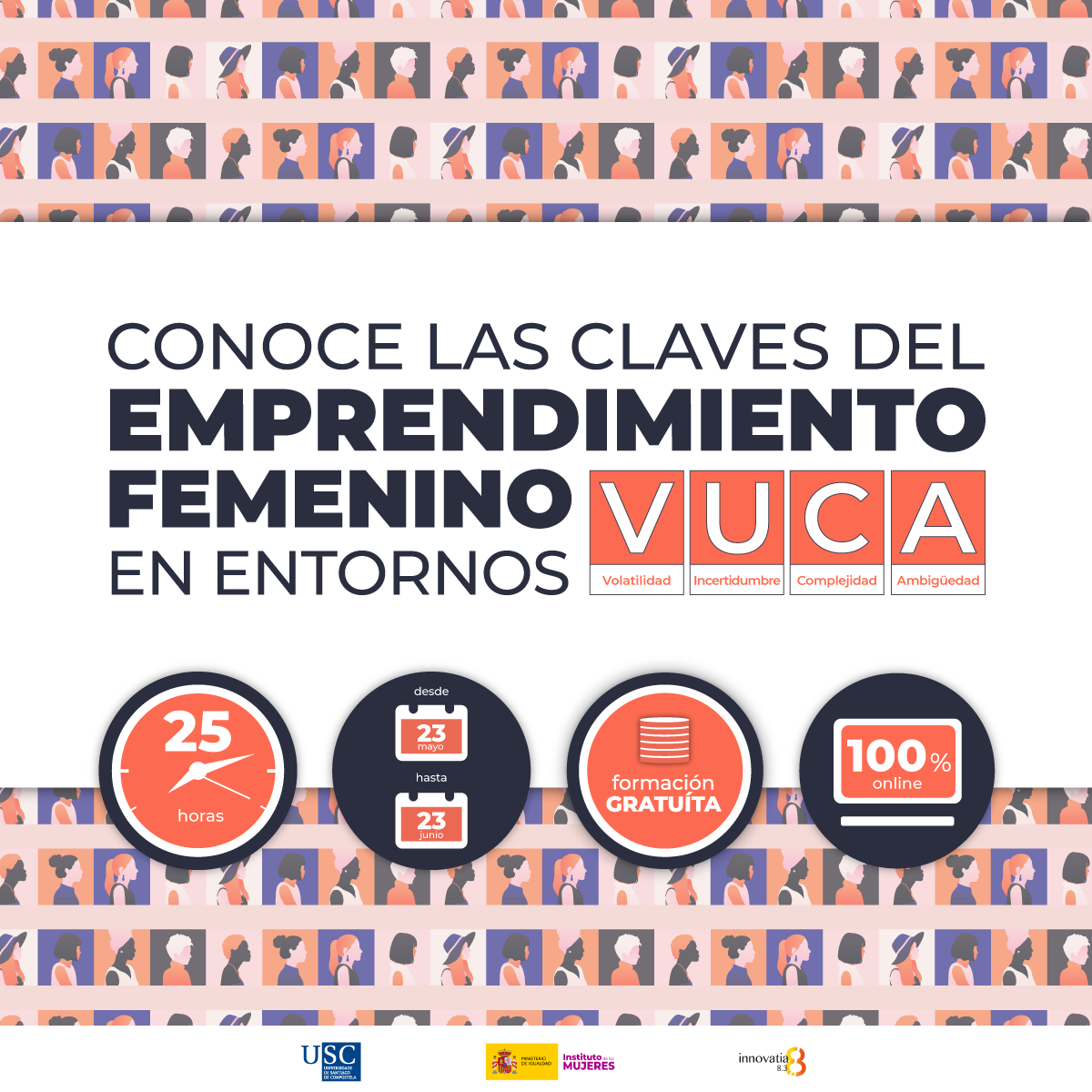 USC e Instituto das Mulleres, no marco do programa Innovatia 8.3, desenvolven a acción formativa ‘Coñece as claves do emprendemento en contornas VUCA’, ou o que é o mesmo, volatilidade, incerteza (en inglés, "uncertainty"), complexidade e ambigüidade. “Nestes momentos de incerteza e cambio constante, podemos dar un cambio á forma de traballar para ver as oportunidades e aprender un bo modelo, no que nos sintamos cómodas”, explican dende as dúas institucións.