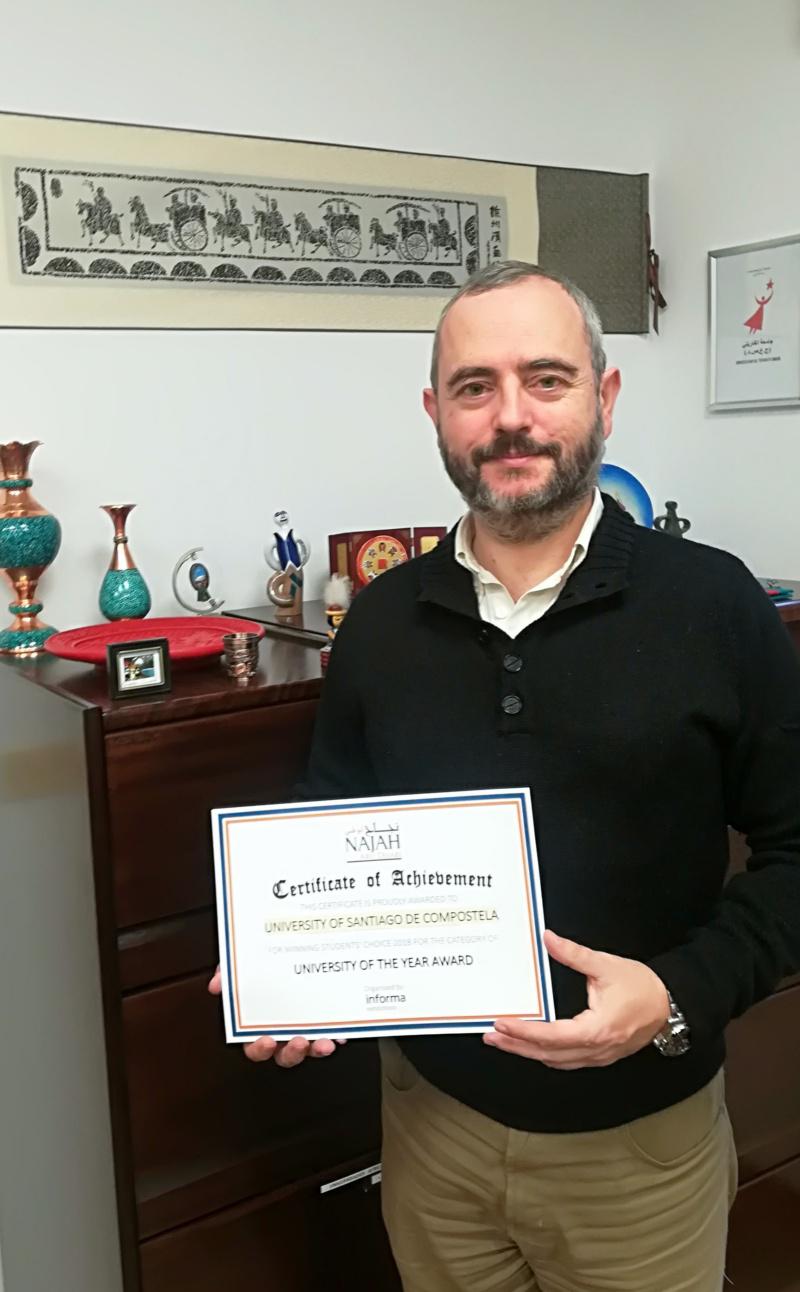 “Recibimos a nova deste premio con grande entusiasmo. Resulta extremadamente gratificante ter sido galardoado como Universidade do Ano por NAJAH nunha votación realizada polo noso alumnado. É un recoñecemento ao bo facer de todos os que formamos parte da institución”, sinala o vicerreitor de Estudantes e Internacionalización, Víctor Arce Vázquez.