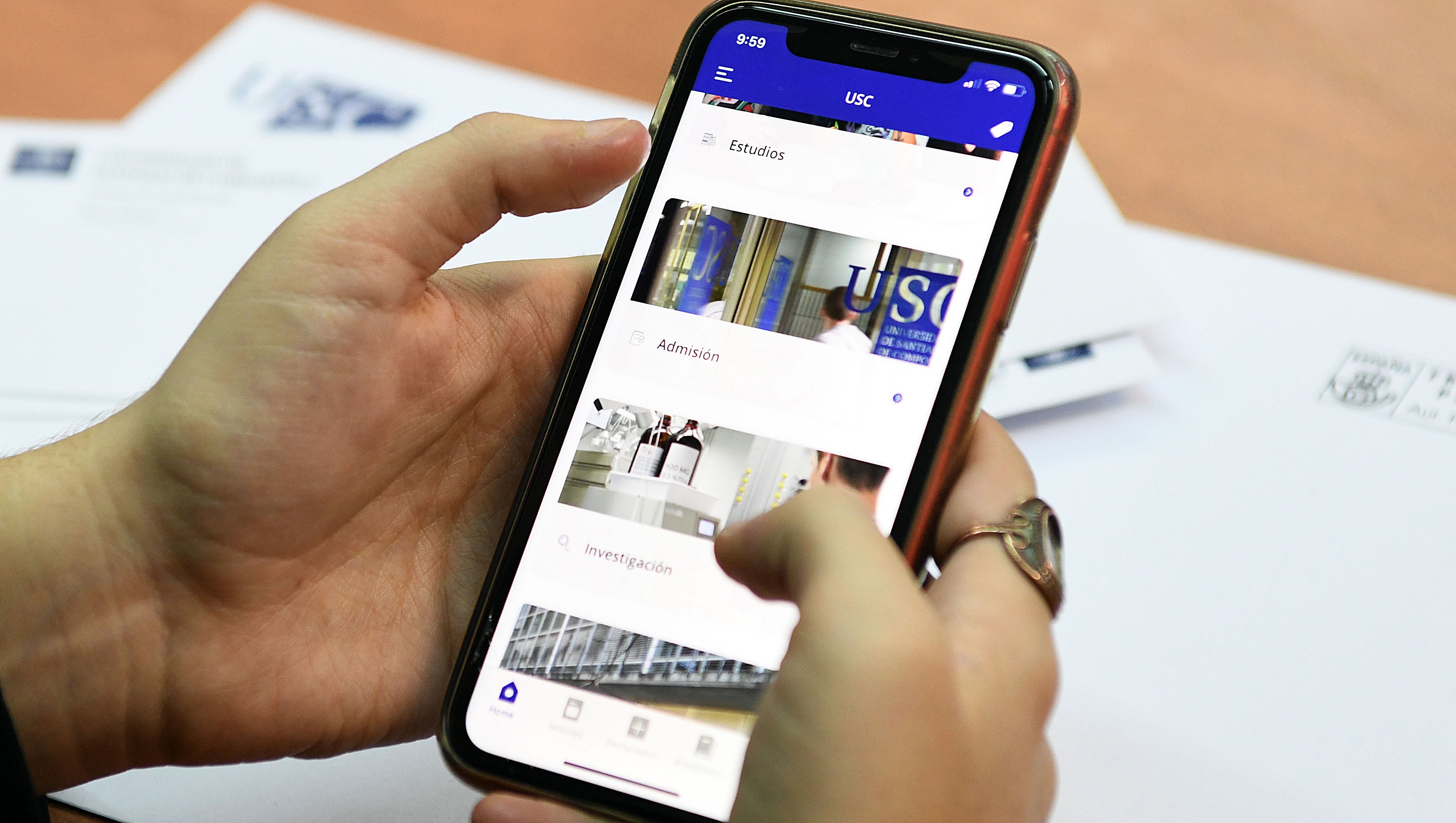 A USC acaba de dar un novo paso na súa transformación dixital co lanzamento dunha nova aplicación para dispositivos móbiles que abre novos espazos de diálogo coa comunidade universitaria e a contorna social. Esta App que xa pode descargase de balde, permitirá recibir e intercambiar información actualizada ou realizar trámites coa Universidade de xeito máis doado. A aplicación nace coa vontade de conformar unha canle áxil, eficiente e inmediata de conexión da USC cos seus públicos.