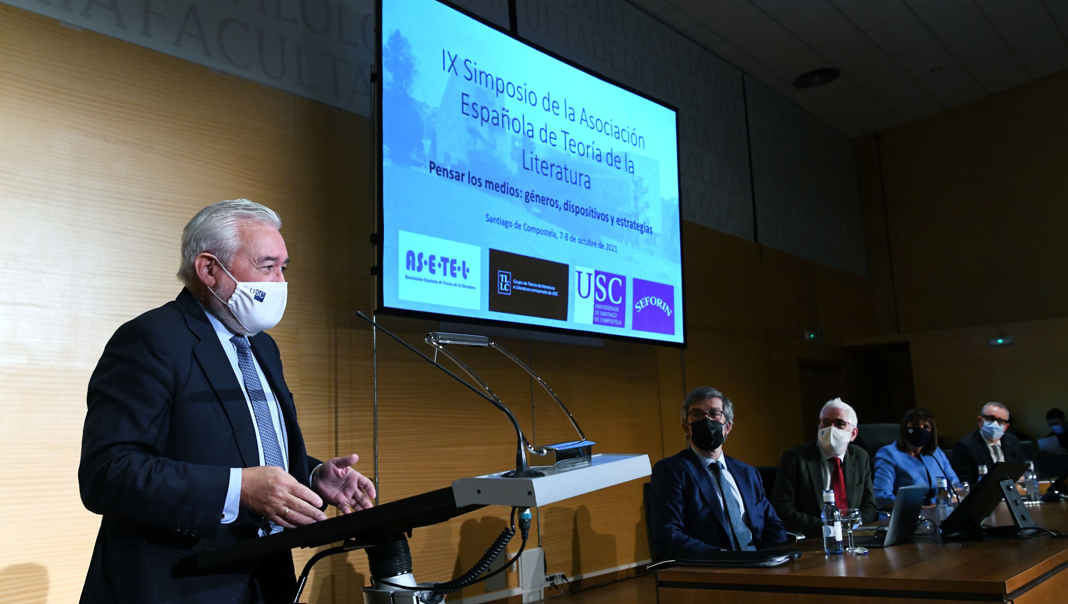 Tamén tomaron parte nesta sesión inaugural o decano da Facultade, Elias J. Feijó Torres; Santiago Fernández Mosquera, director do Departamento de Lingua e Literatura Españolas, Teoría da Literatura e Lingüística Xeral da USC; e Domingo Sánchez-Mesa, presidente de ASETEL. O decano quixo subliñar que “como estudante que fun desta Facultade quero unirme a este recoñecemento xa que o profesor Villanueva é desas poucas persoas que paga a pena oír sempre”. Pola súa parte, o profesor Fernández Mosquera destacou que “para moitos de nós Darío marcou a nosa traxectoria académica e universitaria. Xa dende ese momento como alumnos, sentímolo como un referente. Aprendemos del un xeito de ser e actuar. Foi para nós un modelo de comportamento”.  Ademais de catedrático, reitor da USC entre 1994 e 2002 e director da RAE, o profesor Villanueva (Vilalba, 1950), tal e como se evidenciou no acto deste xoves, constitúe unha figura de referencia no eido da Teoría da Literatura e da Literatura Comparada a nivel internacional, alén de ser doutor honoris causa por diversas universidades europeas e americanas.
