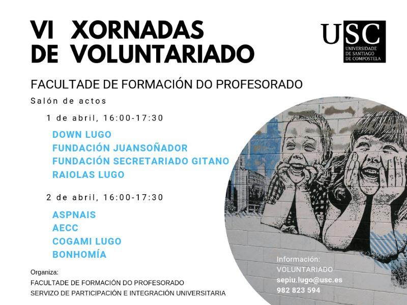Oito entidades sociais participarán os días 1 e 2 de abril na Facultade de Formación do Profesorado no marco da sexta edición das Xornadas de Voluntariado, un foro promovido polo Servizo de Participación e Integración Universitaria(Sepiu) da USC coa pretensión de servir de acicate para impulsar a participación voluntaria entre o alumnado do campus de Lugo.