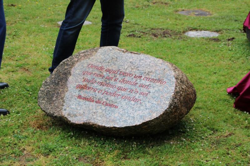 De esquerda a dereita: Anxo Angueira, Martiño Noriega, Juan Viaño, Branca Novoneyra, Marie Seamus, Suso de Toro e Luz Pozo Garza. Foto: Paula Martínez Graña Pedra gravada con versos de Rosalía de Castro. Foto: Paula Martínez Graña