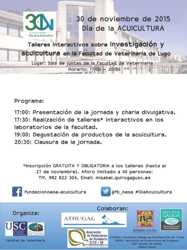 A Facultade de Veterinaria do campus de Lugo súmase este luns 30 de novembro á celebración do Día da Acuicultura coa organización dunha xornada informativa e de divulgación no marco da que se desenvolverán diversos talleres de investigación e acuicultura, ademais dunha degustación de produtos acuícolas.