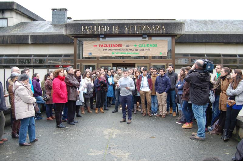 A concentración celebrada este xoves na entrada principal da Facultade de Veterinaria de Lugo congregou a máis de medio cento de persoas, entre docentes, estudantes e profesionais xa egresados. Asemade, tamén se sumaron á protesta outros docentes do campus de lugo, así como a presidenta do Colexio Oficial de Veterinarios de Lugo, Ana López, e a presidenta da EAEVE e profesora na Facultade de Veterinaria de Lugo, Ana Bravo del Moral, ademais da deputada provincial delegada da Área de Medio Ambiente, Sonsoles López Izquierdo. A CDVE advirte neste manifesto dos enormes riscos que reportará a apertura das cinco novas facultades de Veterinaria previstas en Madrid, Lérida, Valencia, Vitoria e Alacante, que elevarían de 12 a 17 as facultades xa existentes na actualidade, unha oferta que cualifican de sobredimensionada e que duplicaría e incluso triplicaría o número de facultades de Veterinaria existentes noutros países, tales como Reino Unido (5) ou Francia (4). A creación de máis facultades de Veterinaria danará seriamente os futuros profesionais, porque suporía unha perda do excelente nivel académico actual e que está avalado pola Unión Europea, sobredimensionaría a oferta nacional destes estudos, saturaría o mercado laboral disparando o paro e a precariedade laboral, ademais, de acentuar o déficit económico que soportan as universidades públicas españolas, recolle este comunicado elaborado pola CDVE Os proxectos de ampliación de facultades de Veterinaria en España xa previstos pasan por crear unha facultade pública na Universidade de Lleida para el curso 2015-2016; outra tamén pública na Universidade de Valencia para el curso 2016-2017, unha terceira pública de próxima apertura na Universidade do País Vasco, e dous centros privados en Alacante e Madrid. Solo se necesitan entre 4 e 7 facultades en España A CDVE advirte neste documento de que xa hai en España máis facultades de Veterinaria das que se precisan. Lembra neste senso que a European Association of Establishments for Veterinary Education (EAEVE) e a Federation of Veterinarians of Europe (FVE), que se encargan de que os estudos de Veterinaria en toda a UE cumpran uns estándares de calidade mínimos e homoxéneos, consideran que abonda cunha facultade por cada 7-10 millóns de habitantes para que un estado membro dispoña de bos servizos veterinarios. Para conservar este estándar, en España bastaría con ter entre 4 e 7 centros, un rango bastante inferior xa ás 12 actuais e, por suposto, moi lonxe das 14-17 que poderían existir en breve. A Conferencia de Decanos e Decanas de Veterinaria de España (CDVE) insiste asemade na singularidade do caso español, xa que España é, xunto con Portugal e Reino Unido, un dos poucos países da UE nos que hai facultades públicas e privadas. Daquela, de concretarse a iniciativa que propicia o total rexeitamento por parte da CDVE, ocorrería que en na Comunidade Valenciana habería 4 facultades: 3 privadas (CEU-Cardenal Herrera, San Vicente Mártir y Mare Nostrum) e unha pública (Universidade de Valencia); e na Comunidade de Madrid habería 3 facultades: unha pública (Complutense) e dúas privadas (Afonso X e Europea), unha situación que ven “rocambolesca”. Unha das carreiras máis custosas Outro dos problemas de calado para a CDVE refírese ao desembolso importante que require contar cunhas instalacións acordes aos estándares solicitados por la EAEVE para impartir Veterinaria: centros dotados de aulas, laboratorios, microaulas informáticas, salas de disección e necropsias, etc.; un hospital clínico veterinario aberto as 24 horas ao día os 365 días do ano; unha granxa docente veterinaria; una planta piloto de tecnoloxía de alimentos; un profesorado altamente cualificado. En total, unha inversión inicial duns 15 millóns de euros e un mantemento anual de entre 8 e 10 millóns. Na opinión da CDVE, segundo o manifesto ao que deu lectura en Lugo Germán Santamarina, “é evidente que as universidades públicas dificilmente pode afrontar estes gastos, xa que as matrículas cobren apenas un 10%-15% do orzamento, mentres que as universidades privadas optan polos recortes e a conseguinte perda de calidade docente e de formación para poder sufragar os gastos”. Máis graduados que empregos Cada ano gradúanse nas universidades españolas 1.200 estudantes de Veterinaria, unha cifra que duplica o os postos de traballo xerados no mesmo período de tempo. Esta sobre oferta de titulados provocou que o paro rexistrado na profesión pasara nos últimos anos de menos dun 6% a niveis preocupantes e condicións de traballo precarias e pouco dignas, reza o manifesto da CDVE. Con cinco centros máis a situación aínda sería máis insostible, engade a organización veterinaria. Ante esta situación, a Conferencia de Decanos e Decanas de Veterinaria de España solicita ás axencias encargadas de dar luz verde aos diferentes proxectos que non o fagan se non se constata que se conta coas infraestruturas e requisitos antes enumerados. Pide ademais ás autoridades autonómicas en materia de docencia universitaria que valoren a necesidade real dun novo centro e das súas repercusións económicas e urxe ao Consello Xeneral de Colexios de Veterinaria de España, que denuncie esta situación e loite racionalmente contra a apertura de novas facultades.