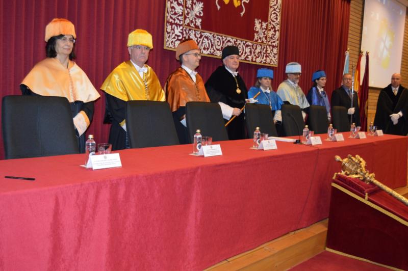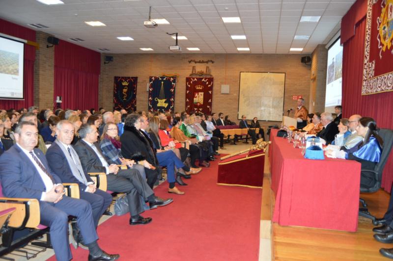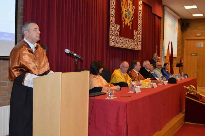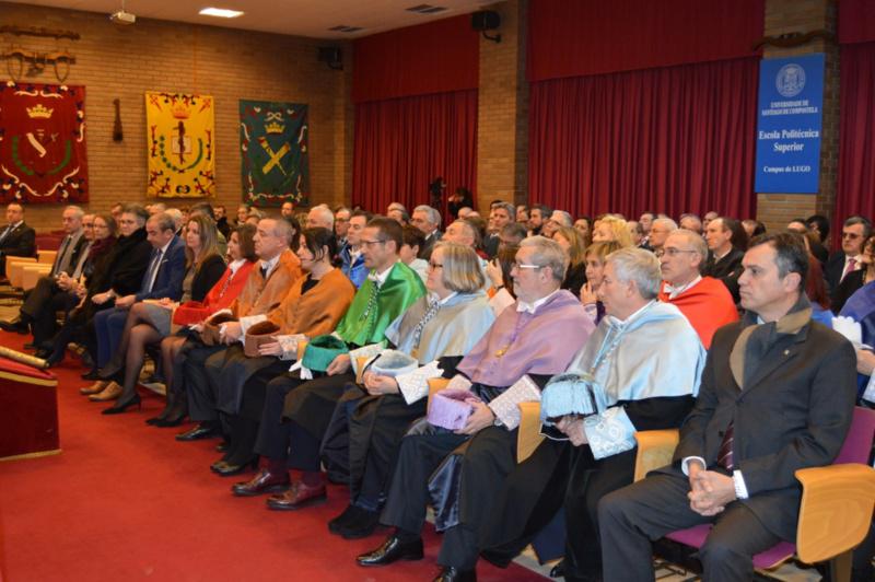 Autoridades académicas e representantes políticos e da sociedade civil presentes no acto O catedrático Manuel Guaita, nun intre da súa lección maxistral Público e autoridades asistentes ao acto académico celebrado na Escola Politécnica Superior de Enxeñaría de Lugo