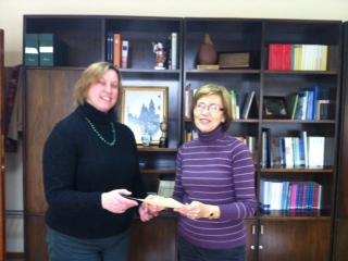 A responsable de calidade da Facultade de Ciencias Económicas, Mercedes Tato, recollendo a certificación de mans da vicerreitora Benita Silva