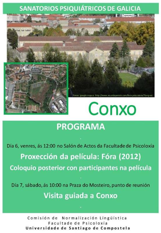 A Comisión de Normalización Lingüística da Facultade de Psicoloxía organiza para este sábado 7 unha visita guiada ao sanatorio de Conxo. O percorrido, para o que non é necesaria inscrición previa, dará comezo ás 10.00 na Praza do Mosteiro, no mesmo barrio.