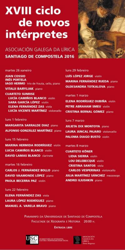 O XVIII Ciclo de Novos Intérpretes que organizan conxuntamente cada ano a Asociación Galega da Lírica e a Universidade de Santiago dará comezo este martes 26. O programa, o dedicado a novos intérpretes máis antigo en activo, contempla nove concertos ata o 8 de marzo no que participarán 40 novos valores da música en Galicia. Todos os recitais serán no Paraninfo da Universidade ás 20.00 horas, con entrada libre e gratuíta.