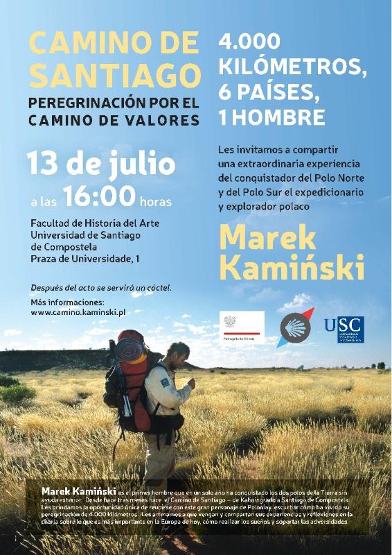 O Paraninfo da Universidade, na Facultade de Xeografía e Historia, acollerá o luns 13 a presentación do proxecto ‘Camiño de Santiago: peregrinación polo camiño dos valores’ de Marek Kamiński, expedicionario, viaxeiro e explorador polaco que rematará a súa peregrinación a Santiago despois de percorrer o camiño durante tres meses de viaxes e atravesar Polonia, Alemaña, Bélxica, Francia e finalmente España. Na presentación na Facultade compostelá, a partir das 16.00 horas, intervirán ademais do peregrino polaco a vicerreitora de Estudantes, Cultura e Responsabilidade Social, Dolores Álvarez Pérez; o embaixador de Polonia en España, Tomás Arabski; a directora xeral de Turismo, Nava Castro Domínguez; e o concelleiro de Educación e Cidadanía, Manuel Dios Diz. O proxecto ten como obxectivo o apoio á Fundación de Marek Kamiński para axudar a nenos e adolescentes enfermos a superar as barreiras propias da súa situación e alcanzar os seus soños ademais de recadar fondos para os Campamentos Europeos de Conquistadores Polares.