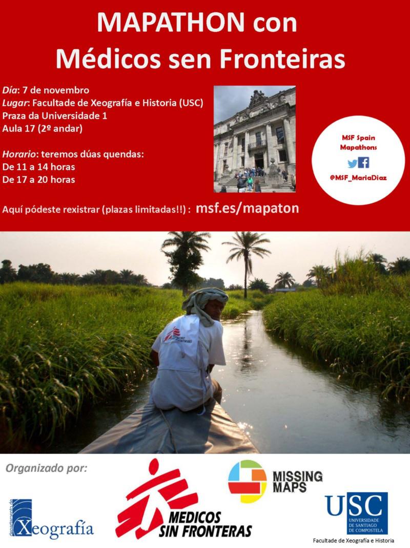 En Santiago ese ‘mapathon’ terá lugar o 7 de novembro na Facultade de Xeografía e Historia, en colaboración co Departamento de Xeografía da USC. Trátase de que as persoas que se inscriban en msf.es/mapaton completen a cartografía, xeralmente de infraestruturas e vivendas, empregando a aplicación Open Street Map. Non son precisos coñecementos previos, pero será de grande utilidade ter experiencia na interpretación de imaxes remotas. De todos os xeitos, haberá persoal de Médicos sen Fronteiras e da USC para axudar a quen decida participar.