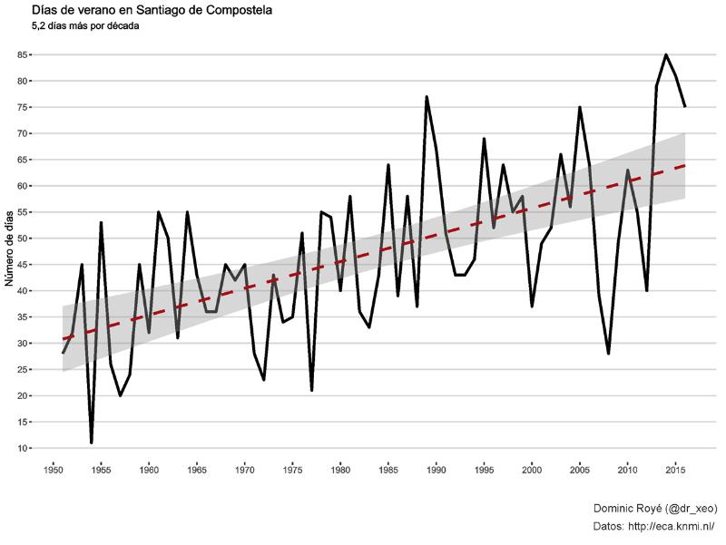 Dende 1950 ata hoxe pasouse en Compostela de 33 días de verán, con temperaturas que alcanzan ou superan os 25 graos, a máis de 60. Este é un dos datos resultantes dun estudo realizado polos xeógrafos da USC Alberto Martí e Dominic Royé que a través da análise de diversos indicadores climáticos e bioclimáticos evidencian os efectos do cambio climático en Galicia. Os dous investigadores pertencen ao grupo Geobiomet que integra especialistas en xeografía e medicina e saúde pública das Universidades de Santiago e Cantabria.