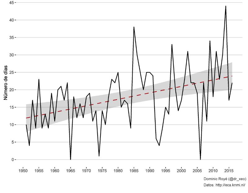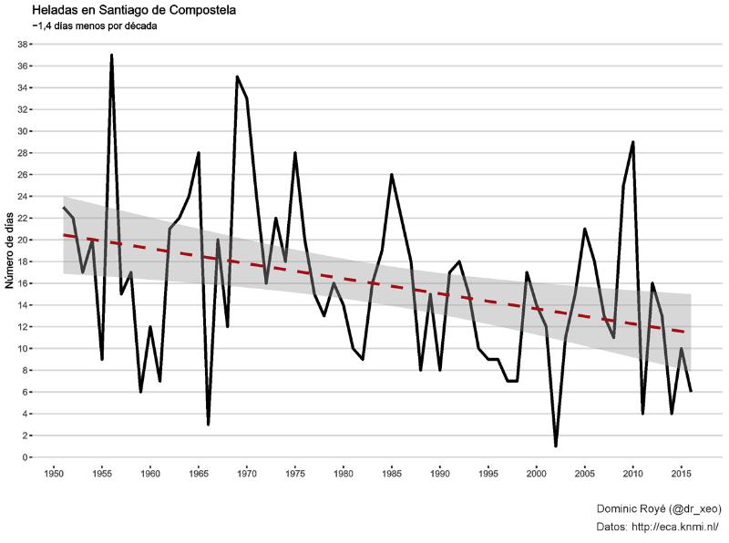 “Estes cambios percíbense tamén nas datas nas que se rexistran os primeiros e os últimos días de verán”, explican Martí e Royé. Se nas décadas dos 50 e 60 en Santiago eses primeiros días calorosos non tiñan lugar como media ata mediados de maio, a partir sobre todo da década dos 70 foron adiantándose a razón de 7,1 días por década, de forma que entre 2010 e 2016 eses días con temperaturas máximas poden comezar xa a rexistrase durante a segunda semana de abril.