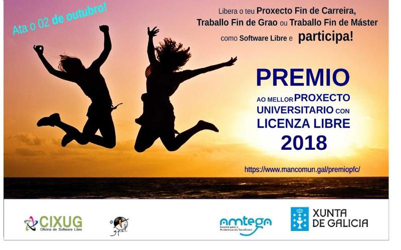 A Axencia para a Modernización Tecnolóxica de Galicia (Amtega) e o Consorcio para o desenvolvemento de aplicacións para a Xestión Universitaria (CIXUG) promoven, en colaboración con outros axentes e entidades, o emprego e a difusión do software libre entre o estudantado universitario galego coa convocatoria do XI Premio ao Mellor Proxecto Universitario con Licenza Libre.