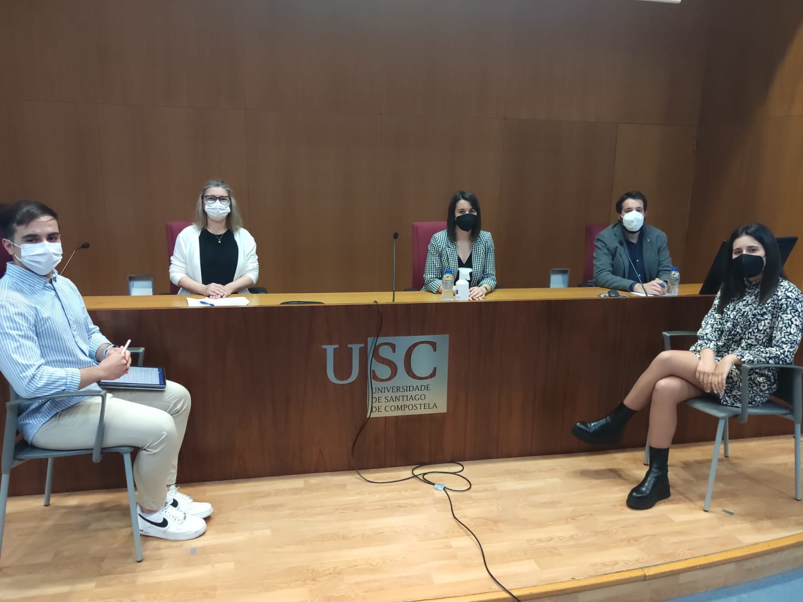 Na mesa relativa a docencia participaron, de esquerda a dereita, as profesoras Isabel López e Raquel Rodríguez, e o profesor Marcos Pazos. Diante, os estudantes Guillermo Álvarez e Lara Padín