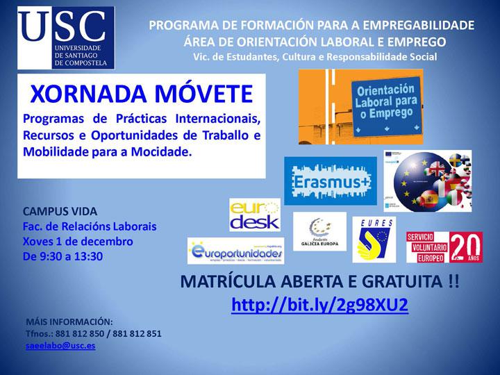 A Universidade de Santiago organiza este xoves, 1 de decembro, a xornada ‘ Móvete. Programas de prácticas internacionais, recursos e oportunidades de traballo e mobilidade para a mocidade’. Terá lugar na Facultade de Relacións Laborais de 9:30 a 13:30 horas.