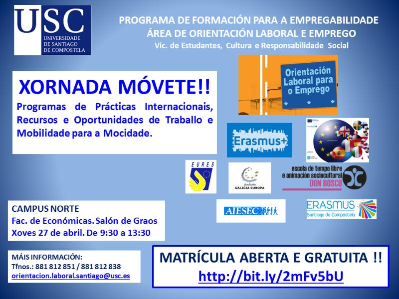 Representantes da USC, da Dirección Xeral de Xuventude, da Fundación Galicia Europa, da Escola de Tempo Libre Don Bosco, do Servizo Público de Emprego e das asociacións AIESEC e Erasmus Compostela participan este xoves 27 na Xornada ‘Móvete!!’ sobre programas de prácticas internacionais, recursos e oportunidades de traballo e mobilidade para a mocidade. Celebrarase entre as 9.30 e as 13.30 horas no Salón de Graos da Facultade de Ciencias Económicas e Empresariais e é gratuíta.