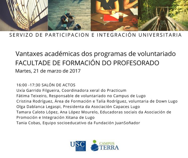 A Facultade de Formación do Profesorado do Campus Terra da USC acolle este martes, a partir das 16.00 horas, no salón de actos do centro, unha xornada sobre programas de voluntariado e vantaxes académicas para o estudantado universitario. Este foro, promovido polo Servizo de Participación e Integración Universitaria (Sepiu), a través da oficina de Voluntariado do campus de Lugo, en colaboración coa profesora Uxía Garrido Filgueira, coordinadora xeral do Practicum na Facultade de Formación do Profesorado, está orientado a estudantes de primeiro curso do grao de Mestre/a en Educación Primaria, aínda que está aberta á participación de todo o público interesado.