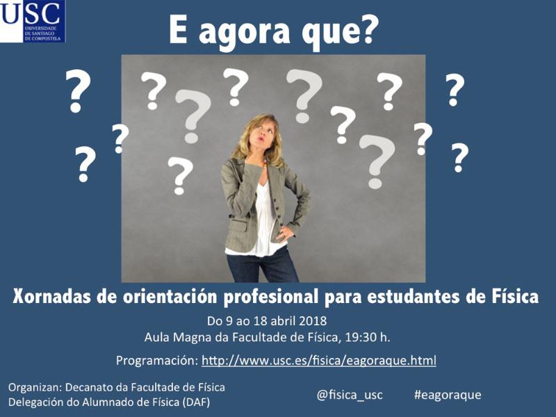 A Facultade de Física organiza entre os días 9 e 18 de abril as xornadas de orientación profesional para o seu estudantado ‘E agora que?’. O programa contempla conferencias e debates, todos ás 19.30 horas, acerca de cuestións que interesan moi directamente ao alumnado que está a cursar estes estudos coa finalidade de orientalos na súa decisión de futuro profesional.
