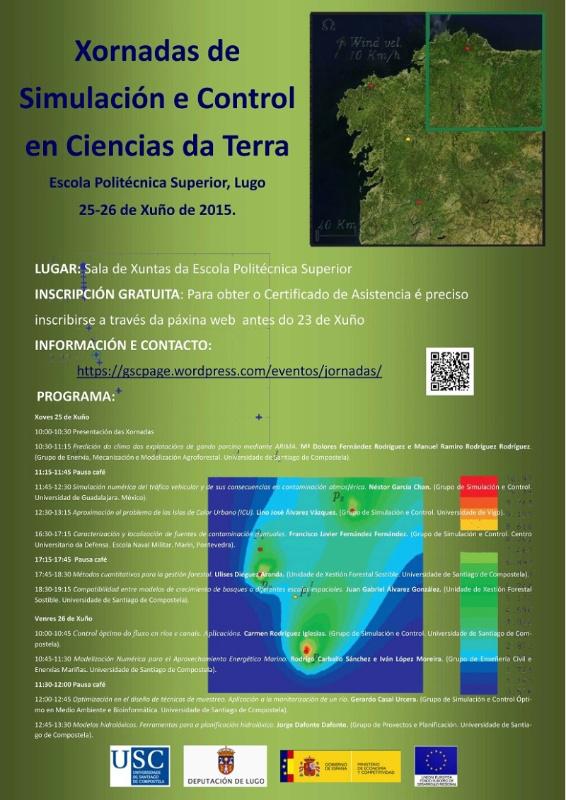 Unhas xornadas de simulación e control en Ciencia da T erra, promovida polos investigadores do Departamento de Matemática Aplicada da USC do Grupo de Simulación e Control Óptimo en Medio Ambiente e Bioinformática Miguel Vázquez e Miguel Vilar, citarán os días 25 e 26 de xuño na Escola Politécnica Superior do campus de Lugo investigadores de Galicia e de México. O prazo de inscrición permanece aberto na web do citado grupo de investigación da USC. O obxectivo destas xornadas, organizadas gracias á colaboración recibida da Vicerreitoría de Coordinación do campus de Lugo da USC, Deputación de Lugo e do Ministerio de Economía e Competencia, a través do proxecto MTM2012-30842 participado por Feder, pasa por amosar algunha das aplicacións no ámbito das Ciencias da Terra no que está especializado o campus de Lugo. O programa deste foro, que xurde a consecuencia do auxe experimentado pola simulación numérica e o control óptimo nas últimas décadas e que na actualidade constitúen disciplinas cun vasto campo de reunirá durante dúas xornadas na Escola Politécnica Superior da USC a expertos en diferentes campos da enxeñaría agraria, forestal, hidráulica, hidroloxía, enerxías renovables… con outros especialistas en simulación numérica e control óptimo de sistemas.