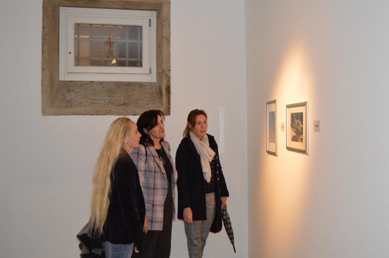 Pilar García, Montserrat Valcárcel e Rosana Rielo ollan dúas das fotografías expostas nunha cella do Vello Cárcere